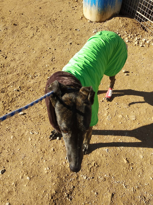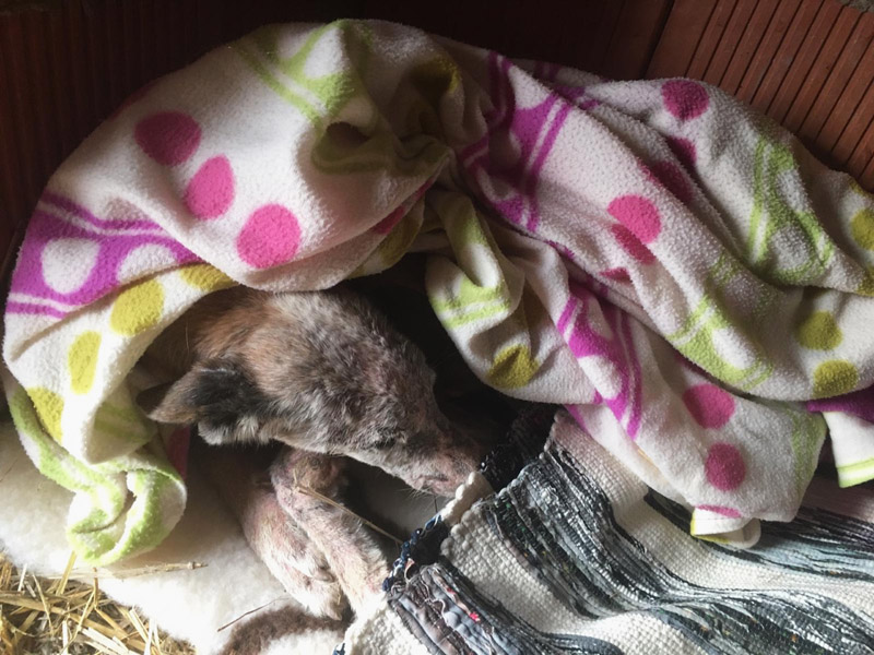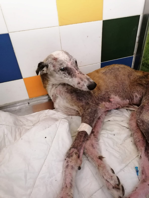 Die zarte Galga Carla wurde fest in Decken eingepackt. Da die Untersuchungsbefunde und Probeentnahmen der Haut noch nicht da sind, muss sie natürlich isoliert werden und kann nicht in eine Pflegefamilie oder zu Rocio in das Pflegestellenhaus. Zum Glück konnte eine Leishmaniose ausgeschlossen werden, aber weitere Ergebnisse stehen noch aus.