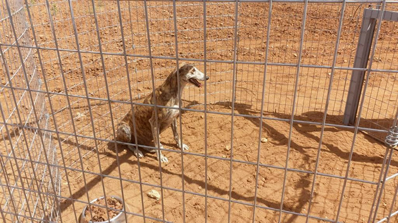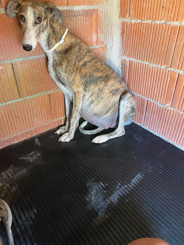 Ebenfalls neu aufgenommen in der Albergue wurde diese hübsche hochschwangere Galga. Seit über einem Jahr wurde sie beobachtet und jetzt konnte sie endlich mit der Lebendfalle eingefangen und gesichert werden.