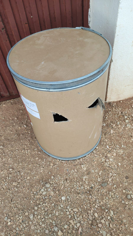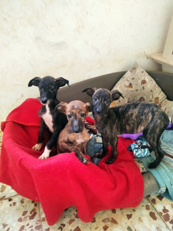 In der Perrera gab es gestern einen besonderen Fund. Als die Mitarbeiter morgens zur Perrera kamen, stand diese Papiertonne vor der Türe- darin drei kleine Galgowelpen ca. 5-6 Wochen alt.