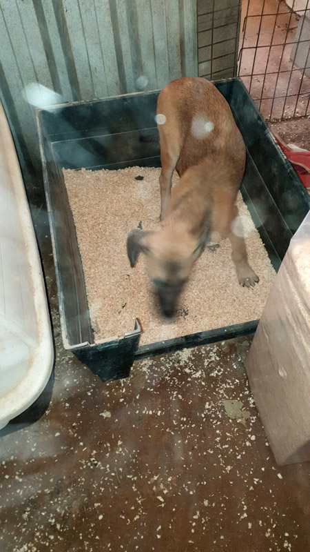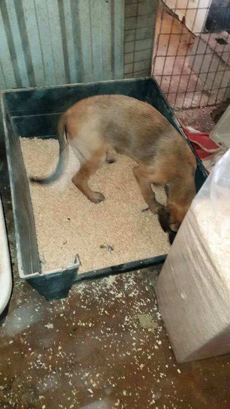 Das alte Strubbelinchen Luna thront in der Flocke. Sie muss ordentlich gepäppelt werden, brachte sie nur 16kg auf die Waage. Dank Eurer Unterstützung konnten wir gleich spezielle Aufbaukost für sie bestellen.
