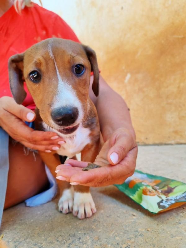Und schon wieder kleine Welpen: hier kommt die Kartonbande :) Duende bedeutet auf Deutsch so etwas wie Elf oder Kobold. Und dieser kleine 'Kobold' wurde mit seinen Geschwistern einfach auf der Straße ausgesetzt. Irgendjemand hatte Mitleid mit den kleinen Würmchen und hat sie ins Tierheim gebracht und dort leben sie nun seit dem 31.Mai. Duende ist rehbraun und hat eine weisse Zeichnung an der Nase, die ihn unverkennbar macht. Zu seinem Glück sucht er nun bloß noch ein eigenes Zuhause, in dem man die Welt mit ihm entdecken möchte und ihn nie wieder alleine lässt. Duende ist noch jung und muss das Hunde 1x1 noch lernen und so wünschen wir uns Menschen, denen bewusst ist, dass ein junger Hund wie ein kleines Kind Zuwendung, Zeit und Erziehung benötigt und dies besonders im ersten Lebensjahr etwas Arbeit für die neue Familie bedeuten kann. Als Belohnung dafür erlebt man natürlich auch viele schöne Momente mit dem neuen Familienmitglied.