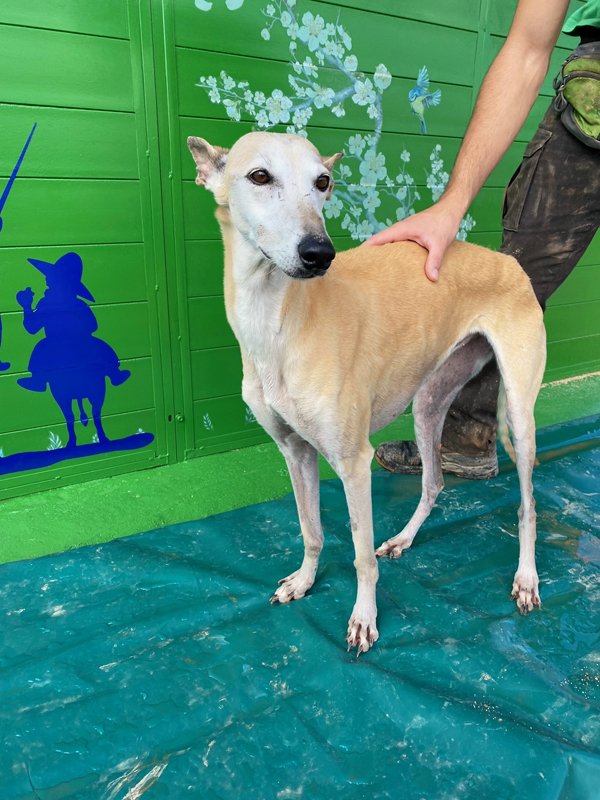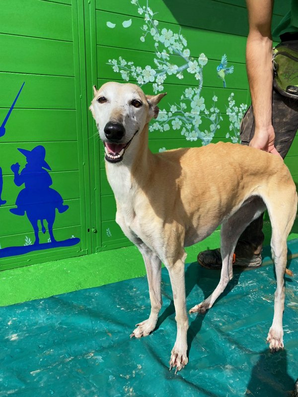Flaka heißt übersetzt 'die Dünne' oder 'die Schlanke' und das passt leider sehr gut. Bei ihrer Rettung war sie unglaublich dünn, was aber bei ihrer traurigen Geschichte auch nicht verwunderlich ist: Flaka war mindestens ein Jahr lang auf einem kleinen Hinterhof eingesperrt, ohne regelmäßiges Futter oder Kontakt zu Menschen. Die arme Flaka war wie ein Spielzeug, mit dem man nicht mehr spielen möchte, einfach weggeworfen. Ihr eigentlicher Besitzer musste ins Gefängnis und die Lebensgefährtin dieses Mannes hatte kein Interesse an der armen Hündin. Man könnte jetzt erwarten, dass Flaka nichts mehr mit uns Menschen zu tun haben wollte, aber genau das Gegenteil ist der Fall. Die Hündin ist sehr anhänglich und verschmust, so als ob sie alles irgendwie nachholen möchte. Deshalb wünschen wir uns für Flaka ein ganz besonders liebevolles Zuhause, sodass sie endlich auch einmal erlebt, was es bedeutet ein eigenes Körbchen zu haben oder verwöhnt zu werden- sie hat es so verdient. Interessenten sollten sich gut über die Rasse Galgo espanol informieren.