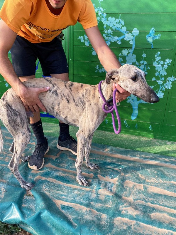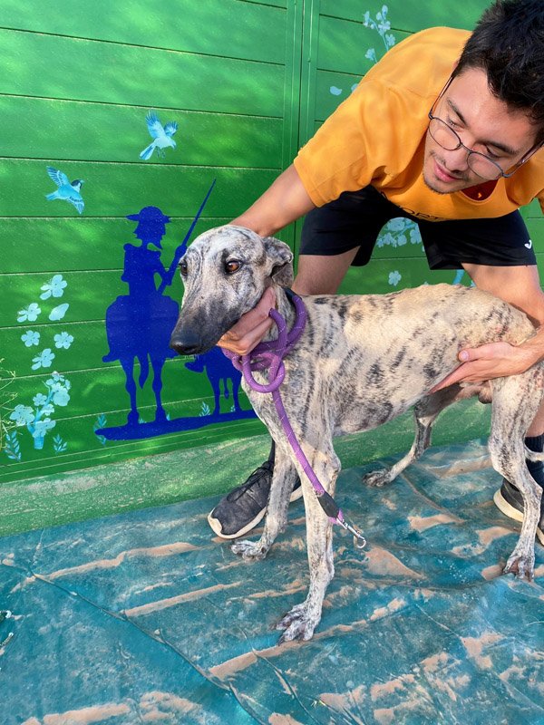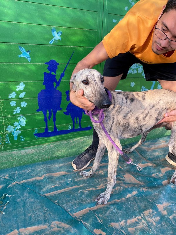 Quijote ist ein gestromter, hübscher Rüde, der auf einer Straße mit einem Seil um den Körper gefunden wurde. Vermutlich wurde er von einem Jäger aussortiert und musste einige Wochen allein überleben. Missbraucht als 'Hetzmaschine', gehalten in einem dunklen Verschlag an einer kurzen Kette, geschlagen, getreten und dann ausgesetzt – das ist die Lebensgeschichte vieler Galgos, die jedes Jahr die Tierheime füllen. Quijote hatte Glück und wurde von einem der wenigen netten Jäger gefunden und in die Albergue gebracht. Quijote hat nach einigen Keksen schnell erkannt, dass ihm nicht alle Menschen feindlich gestimmt sind und genießt mittlerweile die Streicheleinheiten, die er zum ersten Mal in seinem Leben bekommt. Trotz seiner schlechten Erfahrungen ist der schöne Rüde nicht überängstlich, er geht freundlich auf alle Menschen zu und genießt es mit den Menschen um ihn herum die Umgebung zu erforschen und neue Erfahrungen zu machen. Leider ist das im Tierheim nur sehr beschränkt möglich, es sind einfach zu viele Hunde und zu wenige Helfer um jedem Hund gerecht zu werden. So muss Quijote wohl noch ein bisschen weiter von neuen Abenteuern träumen. Haben Sie vielleicht ein Plätzchen für Quijote in Ihrem Heim – und in Ihrem Herzen frei?