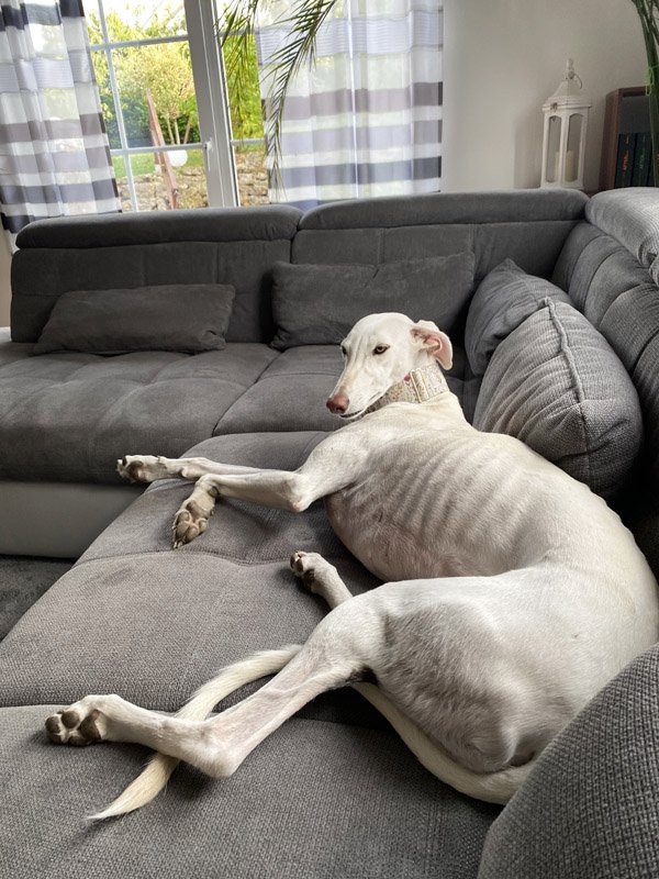 Louise ist eine sehr fröhliche und aufgeschlossene Galga. So sehr sie sich über andere Hunde bei Spaziergängen freut und denen freundlich und aufgeschlossen gegenübertritt und auch gern mit denen durch den Garten tobt, noch mehr liebt sie Streicheleinheiten von ihren Menschen. Kuscheln und schmusen ist für sie unabdingbar und deshalb sehen wir sie, anders als die meisten ihrer Art, tatsächlich eher in Einzelhaltung, wo sie alleine glänzen darf. Draußen zeigt sie sich sehr gut leinenführig. Bellende oder aggressive Hunde ignoriert sie, anders als Katzen. Den rassetypischen Jagdinstinkt kann sie nicht von der Pfote weisen. Grundkommandos wie 'Sitz' und 'Bleib' beherrscht sie. Auch an der Schleppleine und in eingezäunten Bereichen ist sie gut abrufbereit, wenn auch da lieber bei ihren Menschen als irgendwo anders. Das führt auch dazu, dass sie ungern lange Zeit allein ist und hier entsprechend Unterstützung benötigt. Louise ist eine wunderschöne und einzigartig tolle sowie liebebedürftige Hündin, die ein Für-immer-Körbchen mehr als verdient hat. Wir wünschen uns ein Zuhause mit Garten, in dem sie mit Ihrem Kuscheltier ein paar Runden drehen kann. Interessenten sollten sich gut über die Rasse Galgo Espanol informieren.