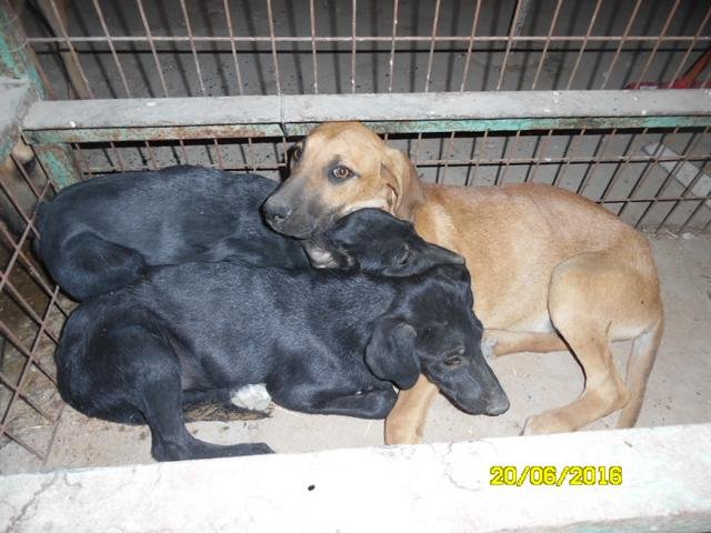 Diese Hunde wurden am Sonntag von Cari und den Tierschützern SOS Rescue bei einem bauffälligen Haus gesichert. Es sind insgesamt 12 Hunde- eine Mutterhündin mit ihren 4 Welpen, 4 Junghunden und 3 Erwachsenen Hunden. Es sind wahrscheinlich alles ihre Kinder. Die Lebensbedingungen der Hunde waren schrecklich- alles war schmutzig, die Hunde waren voller Zecken und Flöhe, ohne Impfungen und voller Würmer fristeten sie die Tage ihres Lebens. Zu essen gab es nur trockenes Brot, was der Hausbesitzer ab und zu hinbrachte. Cari hat ihm die Hunde abgeschwatzt, da sie vermutete das er einige "verschwinden" lassen würde. Eine richtige Beziehung zu diesem Menschen haben die Hunde nicht und wir hoffen, dass sie alle mit der liebevollen Betreuung in der Albergue ihre Ängste vor dem Menschen ablegen und wieder zu fröhlichen Hunden werden.