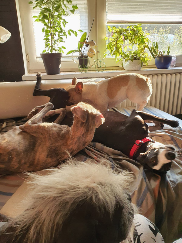 Aber manchmal passt es auch einfach nicht: Galga Clara fühlte sich völlig verloren ohne ein entsprechendes Galgorudel und Herrchen und Frauchen (langjährige Hundebesitzer) bekamen irgendwie keinen Draht zu ihr- aber gemeinsam, wenn auch mit ein paar Tränen, fanden wir ein neues Plätzchen- dort fand sich Clara gleich zurecht. Das erfordert, so finde ich, besonders viel Größe, dann zugunsten des Hundes zu entscheiden. Und wie es immer ist, das Unglück kommt selten alleine: auch Simba konnte sich mit der Einzelhaltung nicht zurechtfinden. Aber auch hier konnte rasch eine Lösung gefunden werden, auch wenn wir hier tief in die Tasche greifen mussten, um einen ordentlichen Transport für Simba zu gewährleisten. Aber zum Schluss waren wir alle zufrieden. Unseren Familien ist es natürlich noch etwas wehmütig ums Herz, was absolut verständlich ist. Aber wir haben gemeinsam die richtige Entscheidung getroffen.
