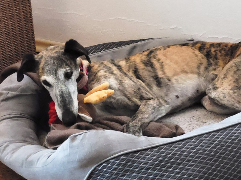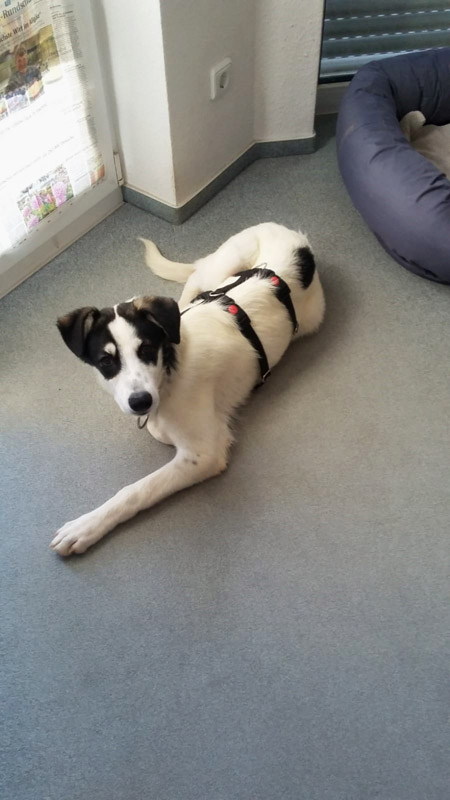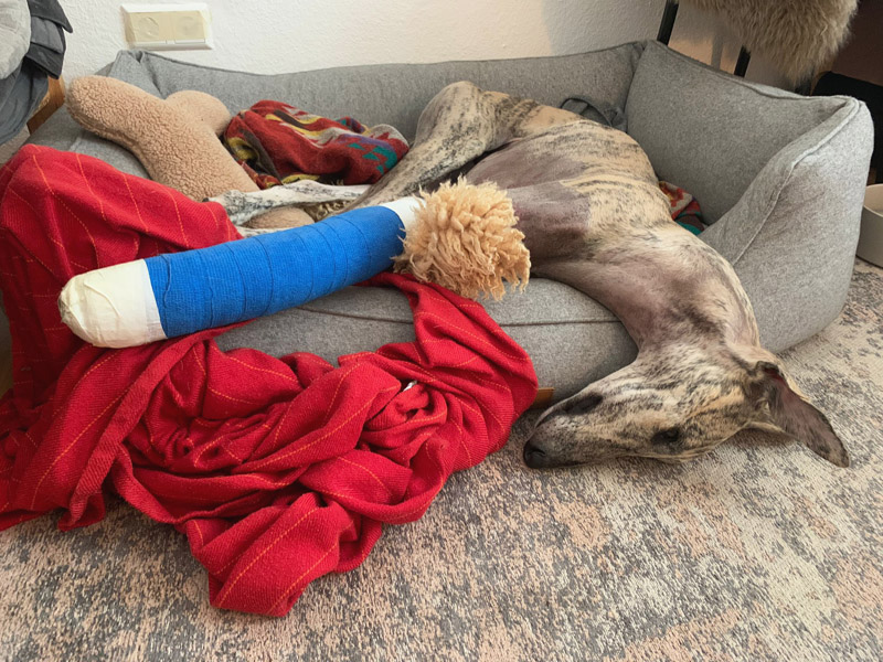 heute müssen wir Euch von unserem Pflegegalgo Loto berichten. Der hübsche Kerl ist wahrlich ein Pechvogel. Kurz vor der Adoption hat er sich nämlich beim Spielen und Toben sein rechtes Vorderbein gebrochen. Elle und Speiche waren beide frakturiert und dissloziiert und mussten notfallmäßig operativ mit einer Platte versorgt werden. Das hat natürlich mit 2200 Euro ein ordentliches Loch in unsere Tierschutzkasse gerissen. Weitere Kosten stehen noch aus, da die Platte wieder entfernt werden muss. Allerdings ist Lotto wirklich ein ganz braver Patient.