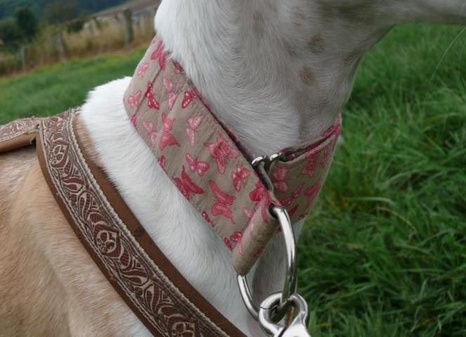 Das Zugstopp-/Martingale: Diese Halsbänder lassen sich so einstellen, dass sie locker und bequem um den Hals sitzen, sich aber bei Zug auf der Leine so weit zuziehen (bis zu einem Stopp), dass sie nicht über den Kopf rutschen, ohne den Hund zu würgen. So kann sich kein Hund herauswinden. Es gibt sie in unterschiedlichen Breiten und Größen.