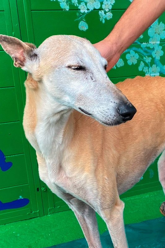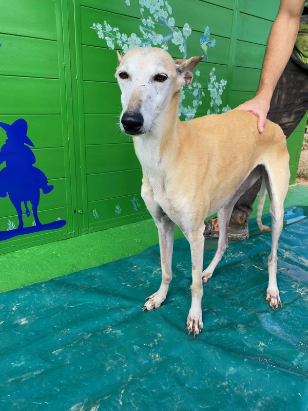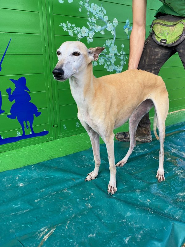 Flaka heißt übersetzt 'die Dünne' oder 'die Schlanke' und das passt leider sehr gut. Bei ihrer Rettung war sie unglaublich dünn, was aber bei ihrer traurigen Geschichte auch nicht verwunderlich ist: Flaka war mindestens ein Jahr lang auf einem kleinen Hinterhof eingesperrt, ohne regelmäßiges Futter oder Kontakt zu Menschen. Die arme Flaka war wie ein Spielzeug, mit dem man nicht mehr spielen möchte, einfach weggeworfen. Ihr eigentlicher Besitzer musste ins Gefängnis und die Lebensgefährtin dieses Mannes hatte kein Interesse an der armen Hündin. Man könnte jetzt erwarten, dass Flaka nichts mehr mit uns Menschen zu tun haben wollte, aber genau das Gegenteil ist der Fall. Die Hündin ist sehr anhänglich und verschmust, so als ob sie alles irgendwie nachholen möchte. Deshalb wünschen wir uns für Flaka ein ganz besonders liebevolles Zuhause, sodass sie endlich auch einmal erlebt, was es bedeutet ein eigenes Körbchen zu haben oder verwöhnt zu werden- sie hat es so verdient. Interessenten sollten sich gut über die Rasse Galgo espanol informieren.