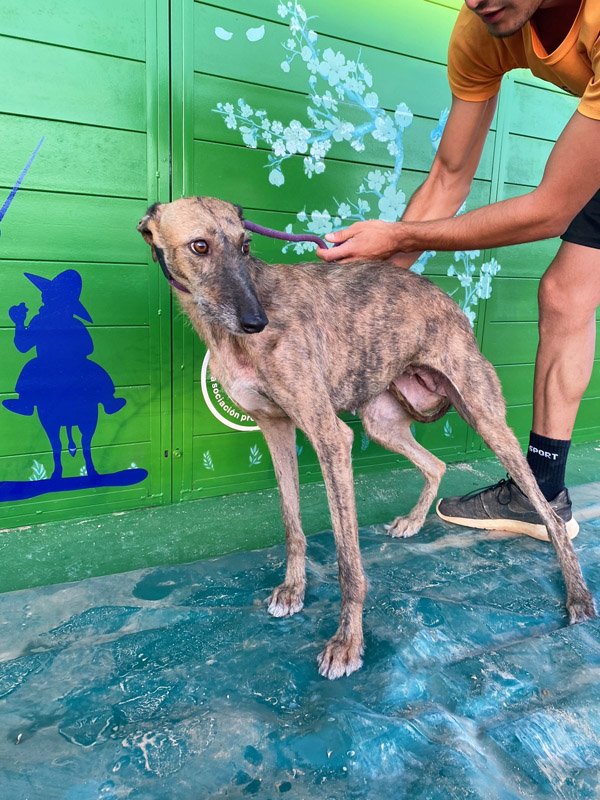 Ona ist eine von vielen Galgos die sprichwörtlich 'weggeworfen' werden, wenn man nicht mehr 'braucht'. Oft ist es so, dass die Hunde in Verschlägen gehalten werden und größtenteils auf sich selbst gestellt sind. Ona wurde zur Zucht missbraucht und man kann an ihren Zitzen sehen, dass sie erst kürzlich Welpen gehabt hatte. Es muss ein schlimmes Leben gewesen sein, das kann man immer noch in ihren Augen lesen und man merkt es an ihrer Zurückhaltung fremden Menschen gegenüber. Bei Ona ist es wie so oft, wenn Galgos durch das Tor des Tierheims kommen, ihr Leben verändert sich. Auch wenn sie noch nicht Teil einer eigenen Familie sind, so ist das neues Leben soviel besser als das Alte. Ona wird nie wieder als Gebährmaschine benutzt werden und darf nun die schönen Seiten eines Hundelebens kennenlernen. Interessenten sollten sich gut über die Rasse Galgo espanol informieren.